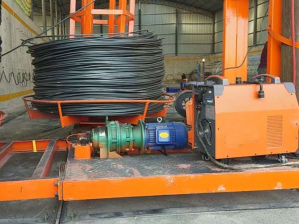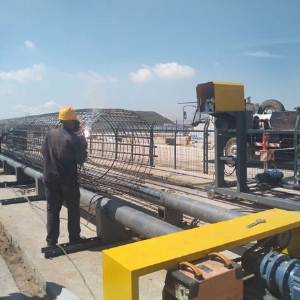 5、繞筋線材經(jīng)過(guò)矯直系統(tǒng),由彎曲狀變?yōu)榻街本€,按螺旋狀纏繞在鋼筋籠上,以保證繞筋間距及形狀的完整。